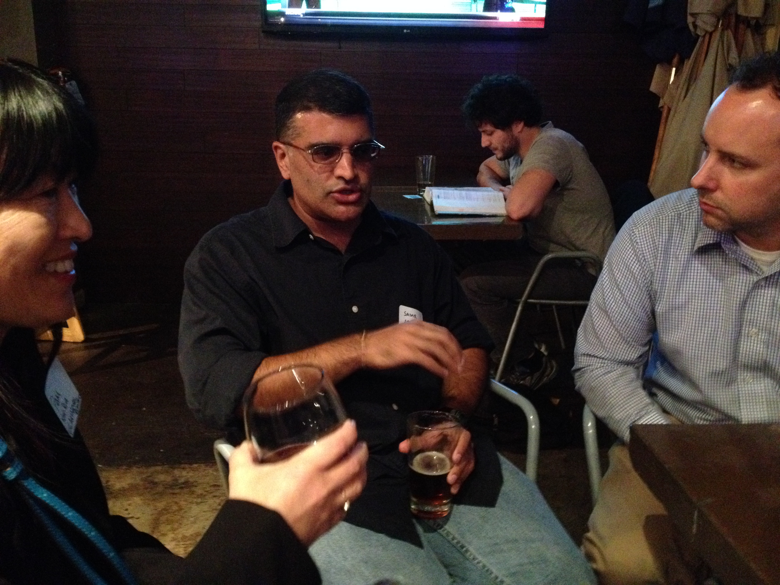 Pam Kan-Rice, Samir Arora and Brad Hooker catch up at the CapSciComm meetup.