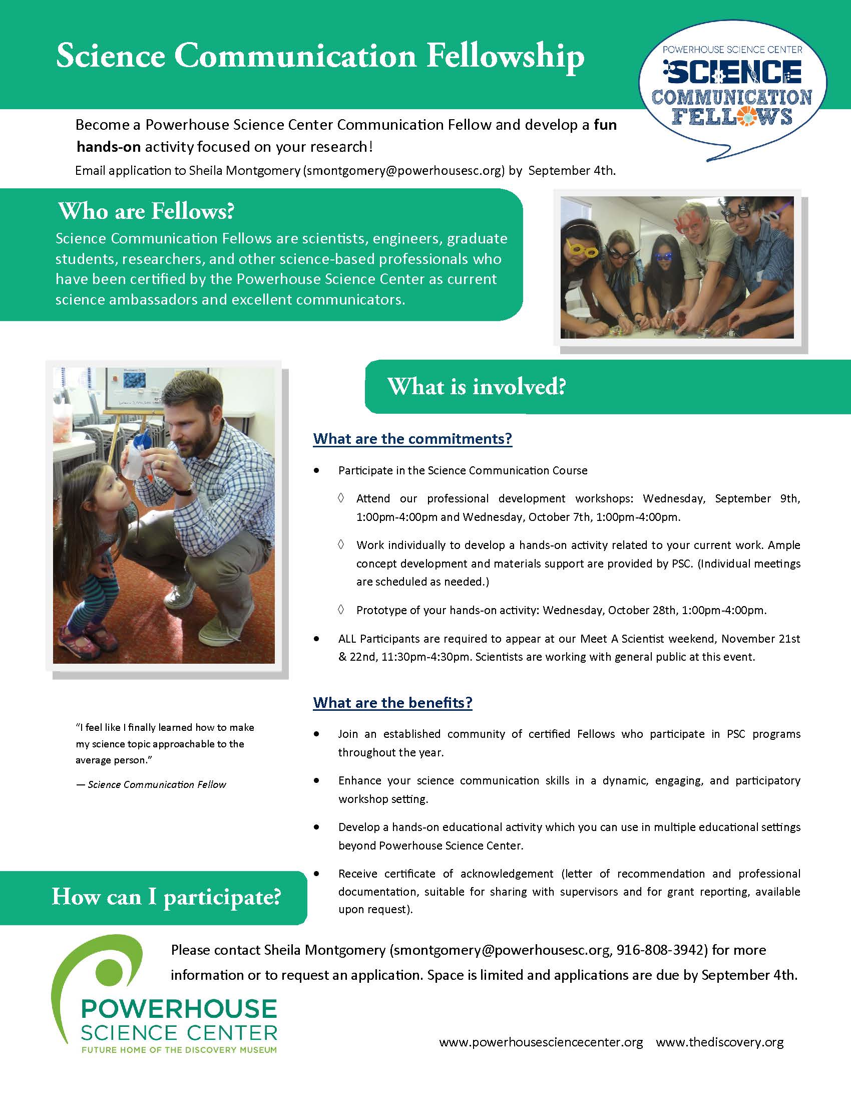 Applications are due September 4th. Contact CapSciComm colleague Sheila Montgomery (smontgomery@powerhousesc.org; (916) 808-3942) for more details and application form.