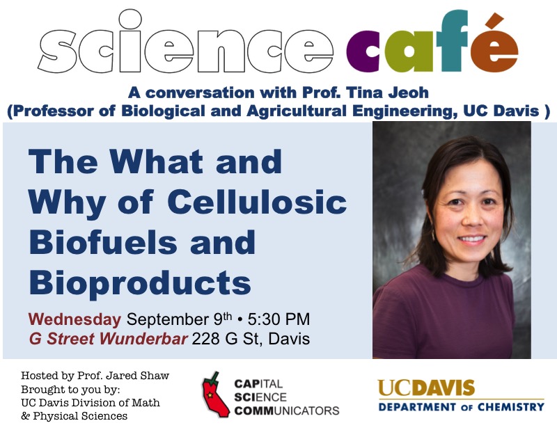 Dr. Jeoh will be our guest at the September rendition of the Davis Science Café. Come with your questions on the chemistry of sustainable materials, and the alchemy of turning plant material into new, durable goods and fuels that might power our future!