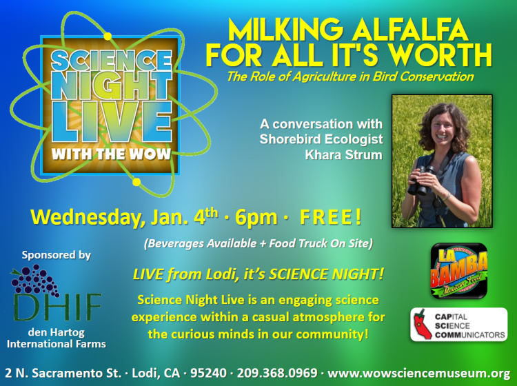Join your host Nick Gray, Education Director at the WOW, for an evening learning experience in Lodi! We all know happy cows come from California, but it takes nearly 600,000 acres of alfalfa to keep them that way! It’s not just the state’s 2 million dairy cows that rely on those land and water resources, though. Learn from Audubon California’s Khara Strum about what happy cows and migratory birds have in common, including the potential impacts of recent groundwater legislation. For a preview, be sure to tune into Capital Public Radio’s Insight With Beth Ruyak program on Tuesday, January 3rd at 9am or the rebroadcast at 7pm.