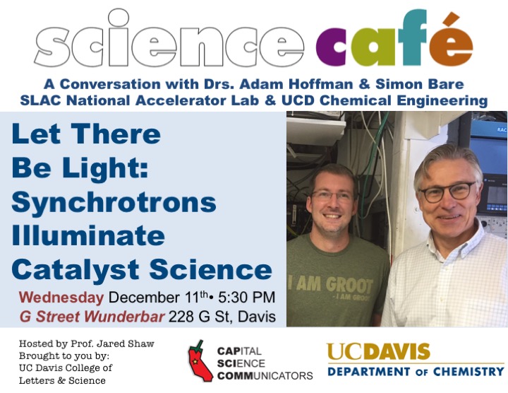 “Let There Be Light: Synchrotrons Illuminate Catalyst Science”Davis Science CaféWednesday, December 11th, 20195:30 – 7:00 p.m.G Street WunderBar228 G St, Davis, California 95616FREE TO ATTENDComplimentary soft drinks courtesy of the UCD College of Letters and Science Each month, Professor Jared Shaw with the UC Davis Department of Chemistry hosts the Davis Science Café, featuring scientists who are studying someContinueContinue reading “Science Café Events in the Sacramento Region in December”