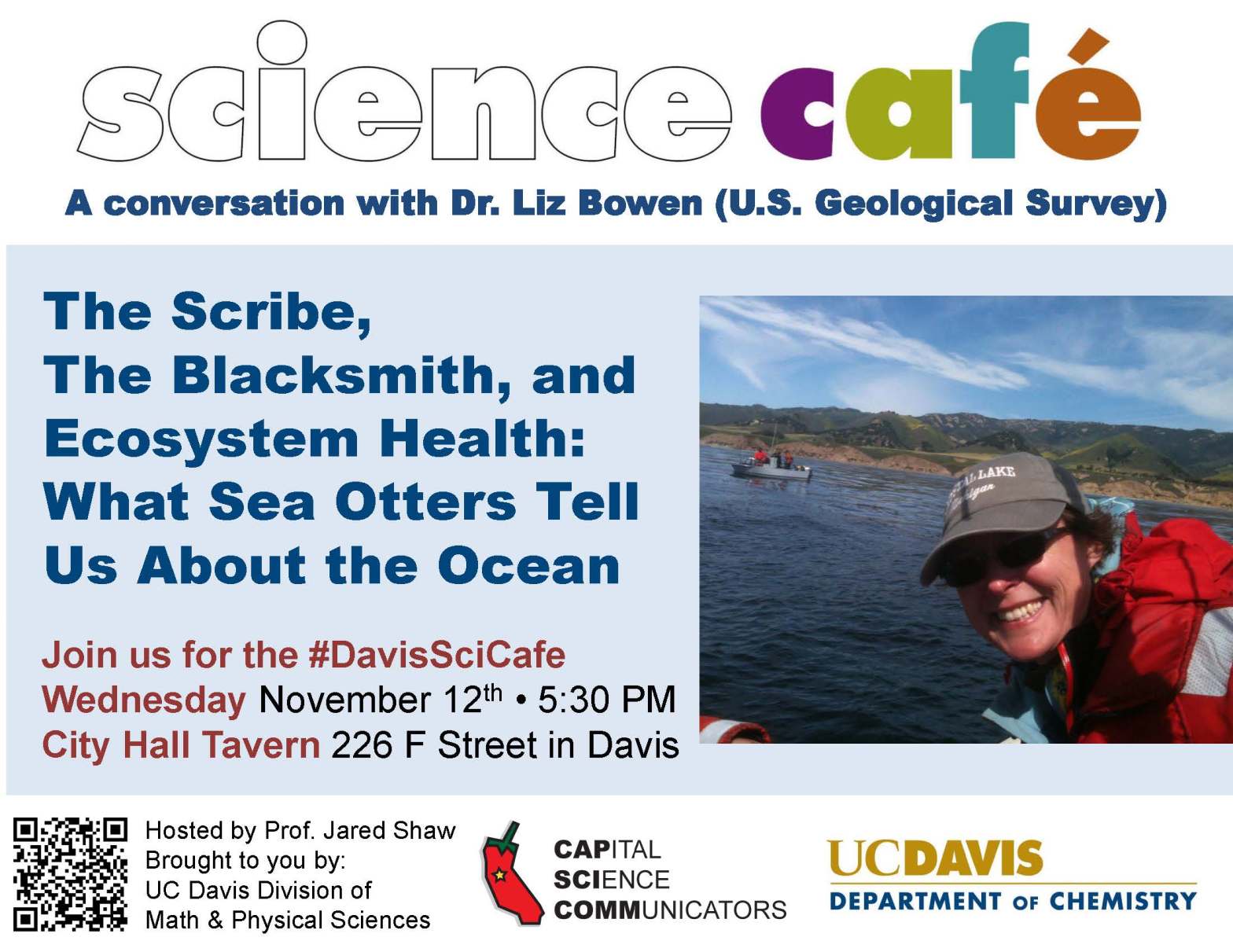 The next Davis Science Café will feature U.S. Geological Survey geneticist Liz Bowen, who will explain what sea otters can tell us about marine ecosystem health. Sea otters may just seem like cute and fluffy animals, but their bodies offer clues to the condition of coastal waters—the same waters that humans use, play, and work in. Bowen,ContinueContinue reading “Davis Science Café on November 12th @CityHallTavern: Sea Otters and Ecosystem Health”
