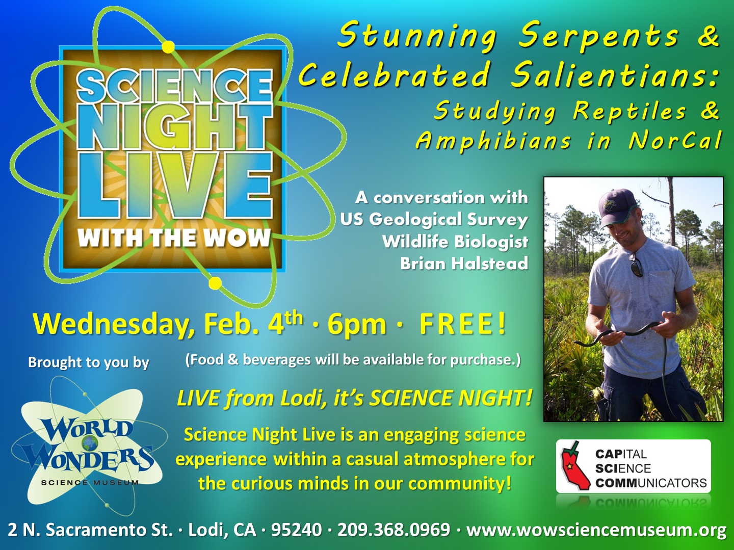 Lodi’s “Science Night Live” science café series is slithering back this February with a heaping of herpetology! “Stunning Serpents and Celebrated Salientians: Studying Reptiles and Amphibians in NorCal” Science Night Live with the WOW Wednesday, February 4th, 2015 6:00 – 7:30 p.m. World of Wonders Science Museum 2 North Sacramento Street, Lodi Free to attend Food andContinueContinue reading “Lodi “Science Night Live” Café Sips Up Stunning Serpents On February 4th”