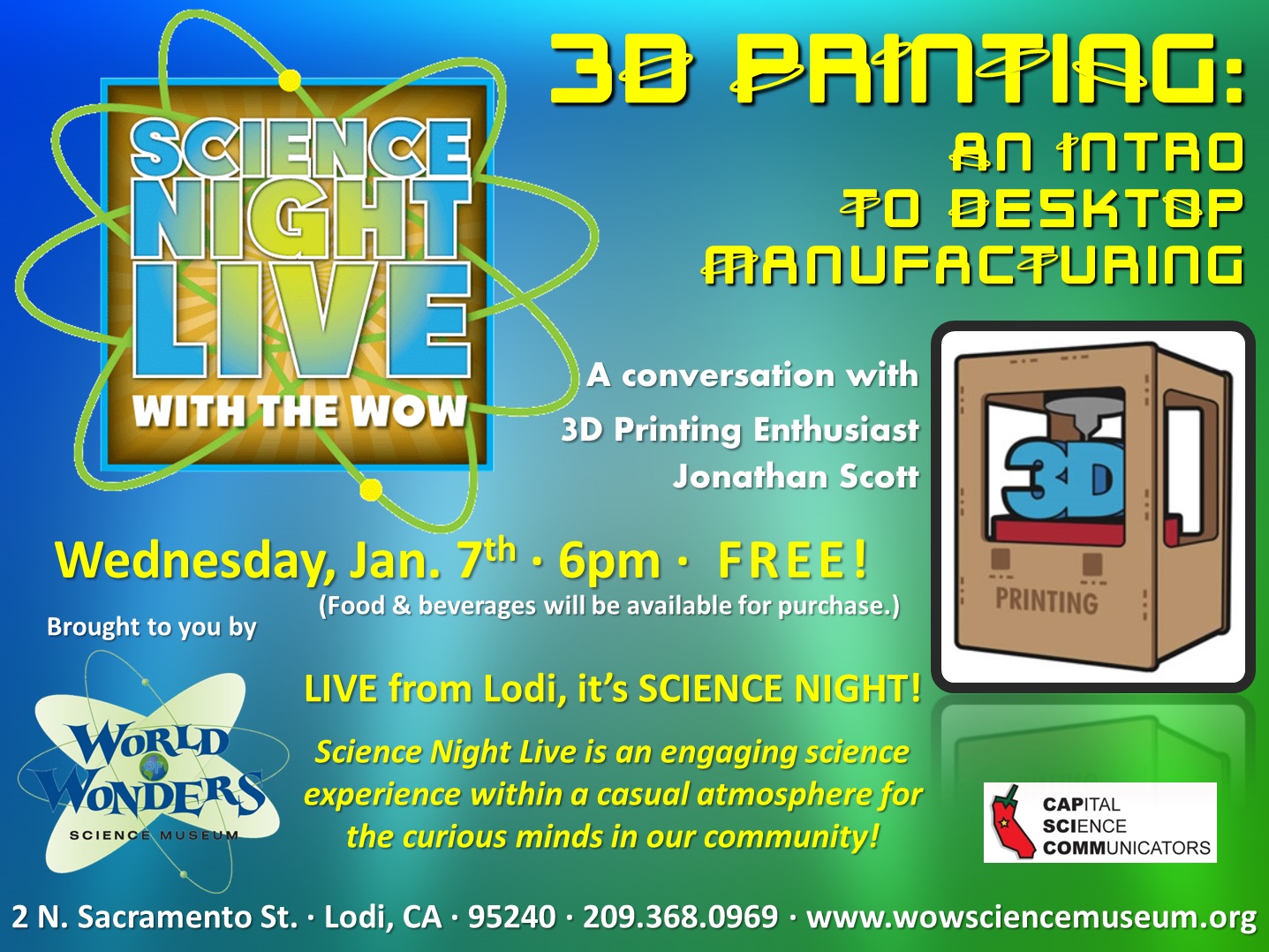 Lodi’s “Science Night Live” science café series is building its 2015 lineup with a primer on 3D printing: “3D Printing: An Intro to Desktop Manufacturing” Science Night Live with the WOW Wednesday, January 7th, 2015 6:00 – 7:30 p.m. World of Wonders Science Museum 2 North Sacramento Street, Lodi Free to attend Food and beveragesContinueContinue reading “Lodi Lines Up 3D Printing Primer for January 7th “Science Night Live””